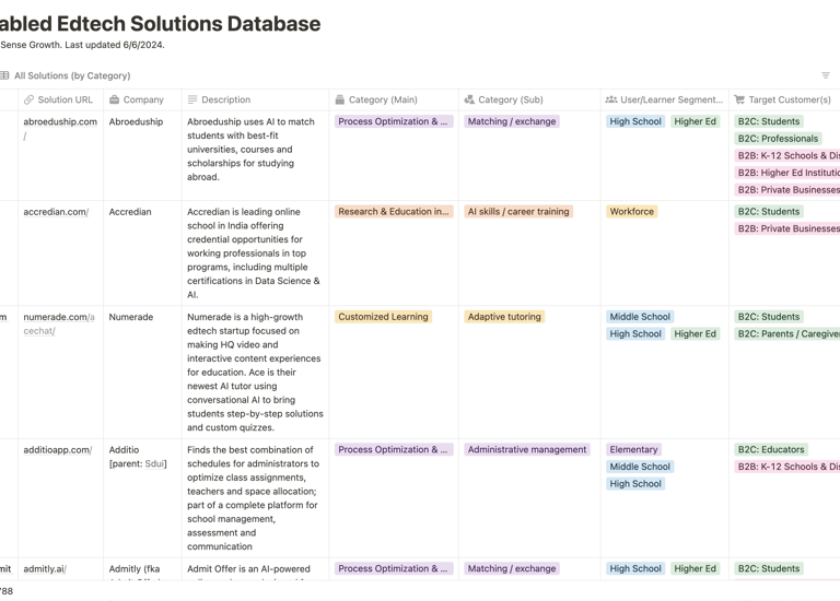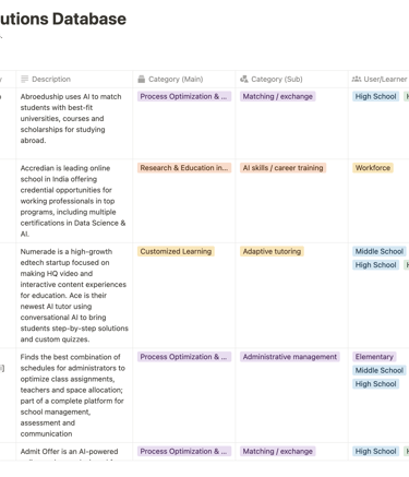 I spent several months researching the Al-in-edtech market, compiling and updating a database of nearly 800 products that included details on each solution's marketed features, relevant learner segments, target customers, and pricing, along with each company's funding and its founders. Using this data, I categorized the solutions and created a market map of the key players. This research helped attract investor interest that allowed CSG to make its first investment in an Al-enabled solution, MagicSchool Al.