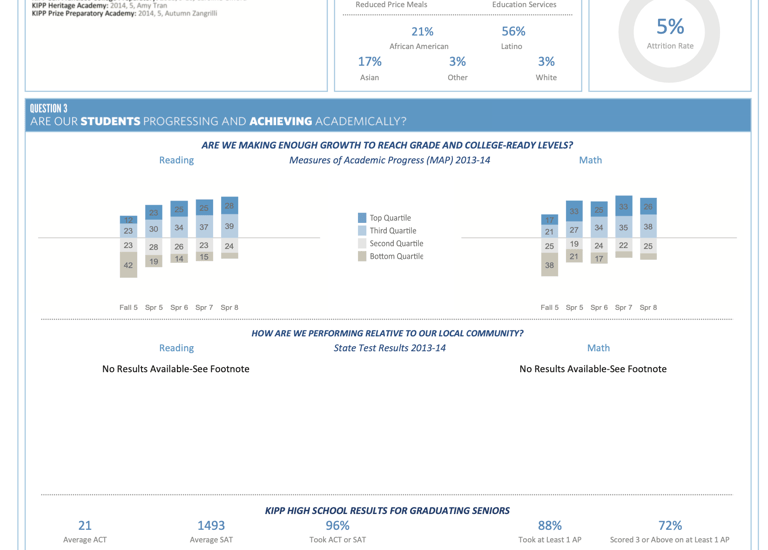 I worked with data managers from 20 KIPP regions managing 162 KIPP schools to collect data on student demographics, student attrition, student achievement, financial aid, and teacher retention. I also executed a process for collecting each school's state test scores (the first year, I collected the scores myself; the second year, I managed a team of temps who collected the scores). I cleaned the data and uploaded it into the Foundation's SQL and Salesforce databases. From that data, I generated reports for KIPP's Annual Report Card and then verified their accuracy with each region's data manager and executive director. I also created exhibits demonstrating each region's achievements in state testing, allowing KIPP to win $4 million in grants and prize money from the U.S. Department of Education and the Broad Foundation.